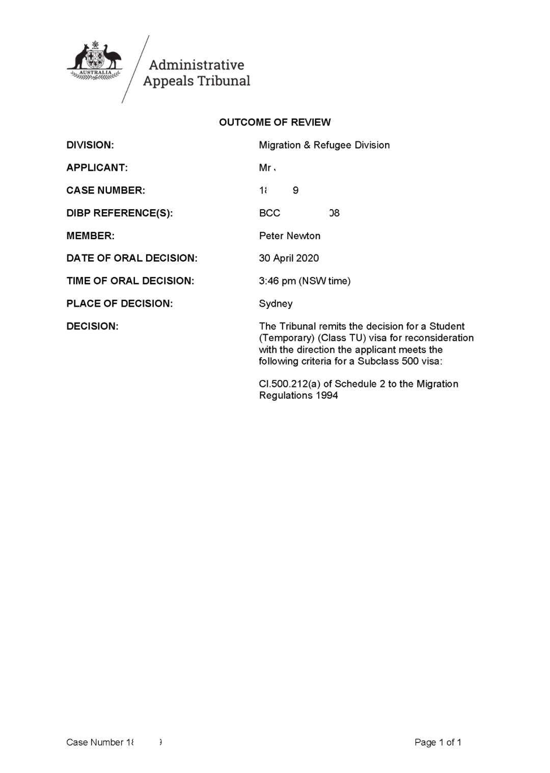澳洲解封,复杂学生签证上诉当庭胜诉 松柏案例专栏 学生背景: 8年前持学生签证入境;大学肄业;与澳人结婚,临居转永居曾被质疑有4020 品行问题,配偶永居申请撤销后申转为学生签证,但被移民局以其学习目的不真实及课程重复就读为由拒签 自疫情肆虐以来,在松柏公司一如既往的努力和指导下, 不少学生签证上诉案都节节出彩,Y 同学是为数不多当庭胜诉的上诉人。 Share this:点击分享到Twitter(在新窗口中打开)点击分享到 Facebook (在新窗口中打开) Related Share: Related Posts 境内复杂配偶签证申请与AAT上诉 改变命运的移民上诉(AAT) 疫情挡不住“惊喜” 一日摘取“配偶临居转永居”